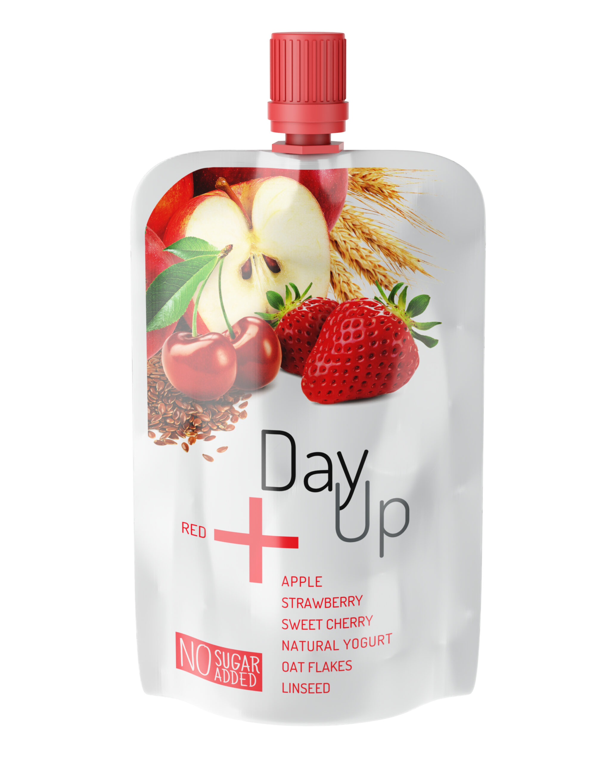 DayUp Classic RED, 120 g Apple purée with natural yogurt, strawberries, sweet cherries and cereals INGREDIENTS LIST (allergens bolded) Fruit purée 69,5% (apple, strawberry, sweet cherry), natural yogurt 26%, oat flakes, linseeds.