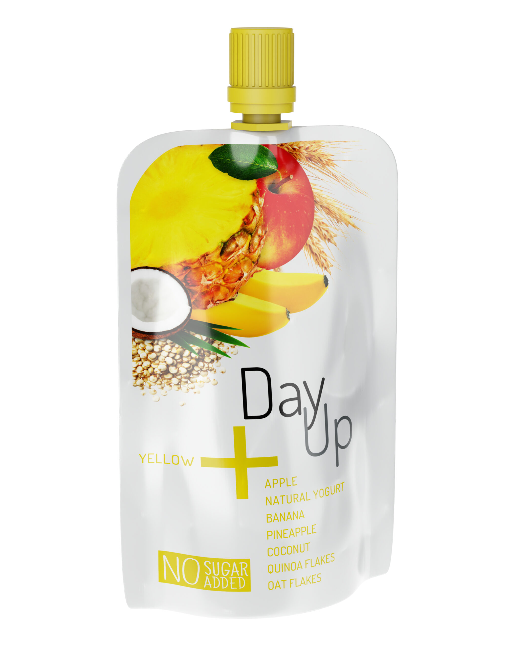 DayUp Classic YELLOW, 120 g Apple puree with natural yogurt, banana, pineapple, coconut and cereals INGREDIENTS LIST (allergens bolded) Fruit purée 68,2% (apple, banana, pineapple ), natural yogurt 26%, shredded coconut, quinoa flakes 1,8%, oat flakes 1,8%