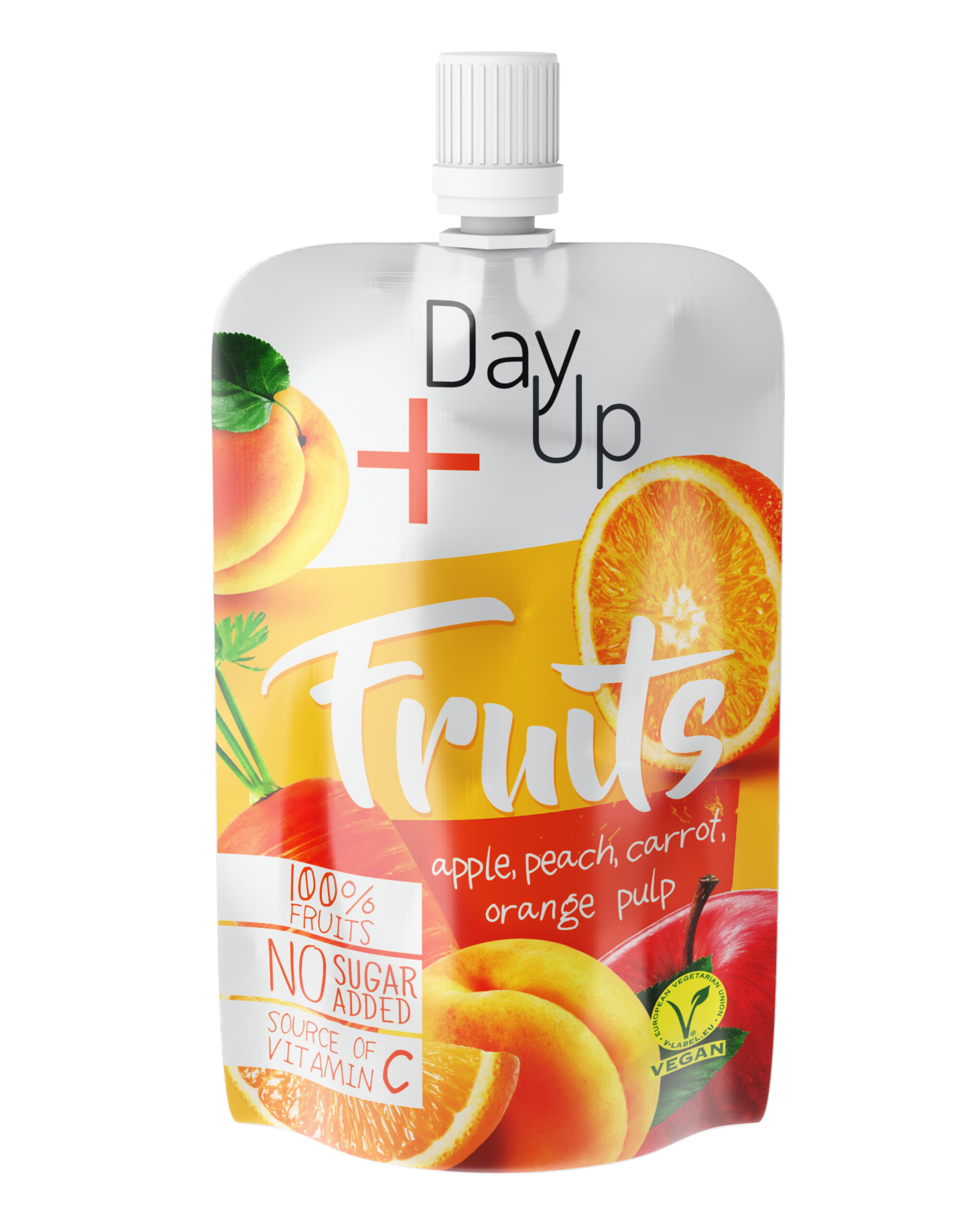 DayUp FRUITS ORANGE, 100 g Apple puree with peach, carrot, orange pulp and vitamin C. Pasteurized product. LIST OF INGREDIENTS (allergens bolded) Ingredients apple puree 67,4 %, peach puree 16 %, carrot puree 10 %, orange pulp 6,5 %, vitamin C.