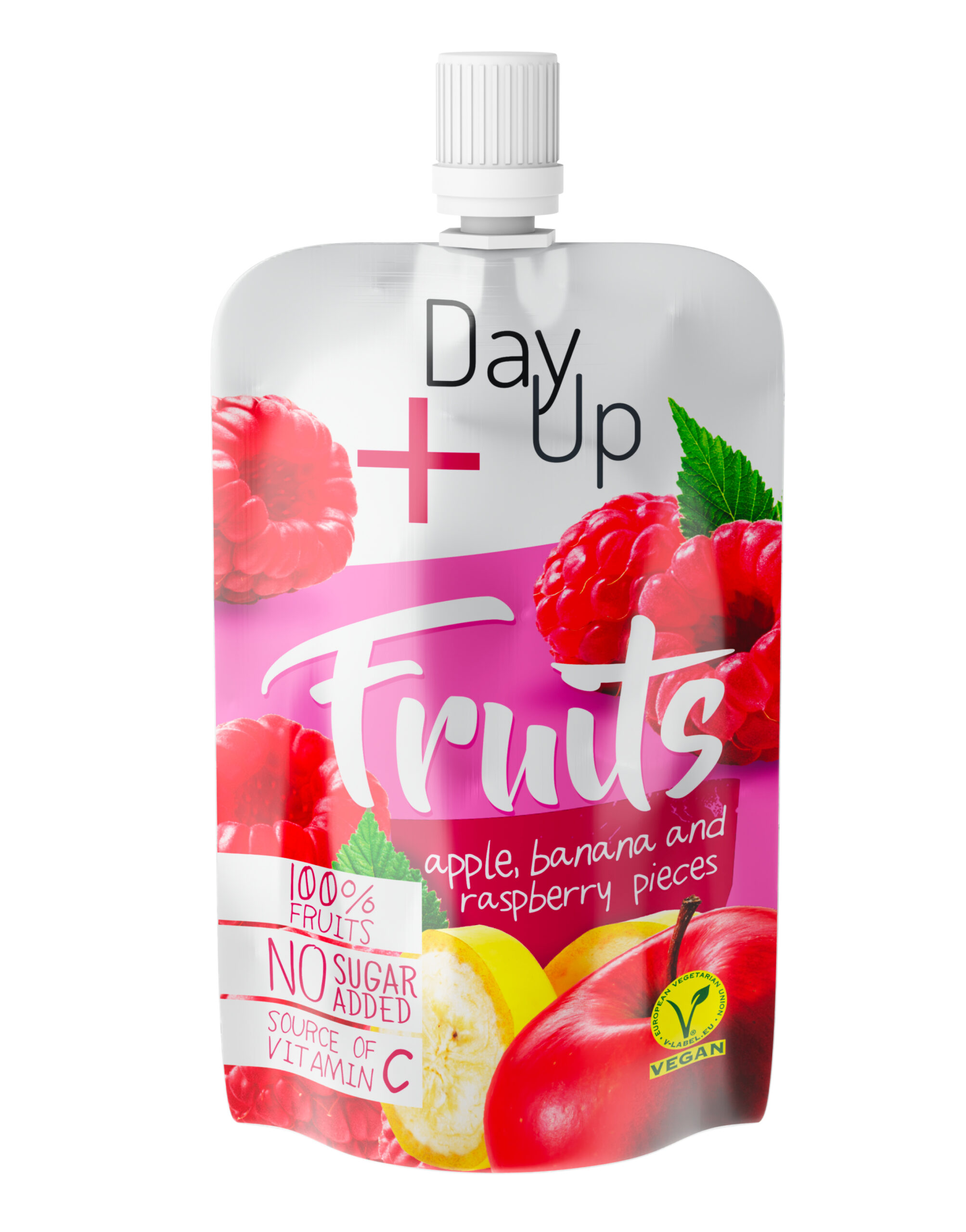 DayUp FRUITS RASPBERRY, 100 g Apple puree with banana, raspberry pieces and vitamin C. Pasteurized product. LIST OF INGREDIENTS (allergens bolded) Ingredients apple puree 64,9 %, banana puree 15 %, raspberry puree 10 %, raspberry pieces 10 %, vitamin C.