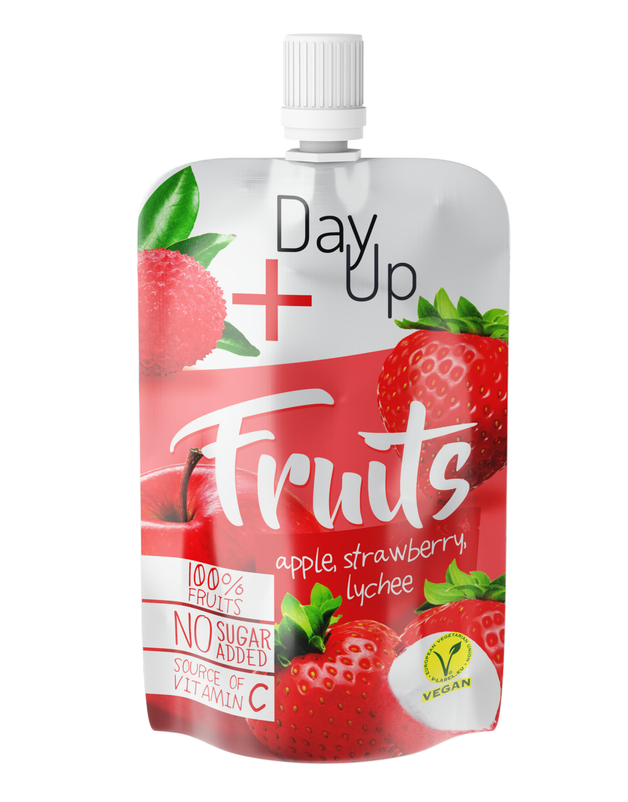 DayUp FRUITS STRAWBERRY, 100 g Apple puree with strawberry, lychee and vitamin C. Pasteurized product. LIST OF INGREDIENTS (allergens bolded) Ingredients apple puree 75,9 %, strawberry puree 18 %, lychee juice 6 %, vitamin C