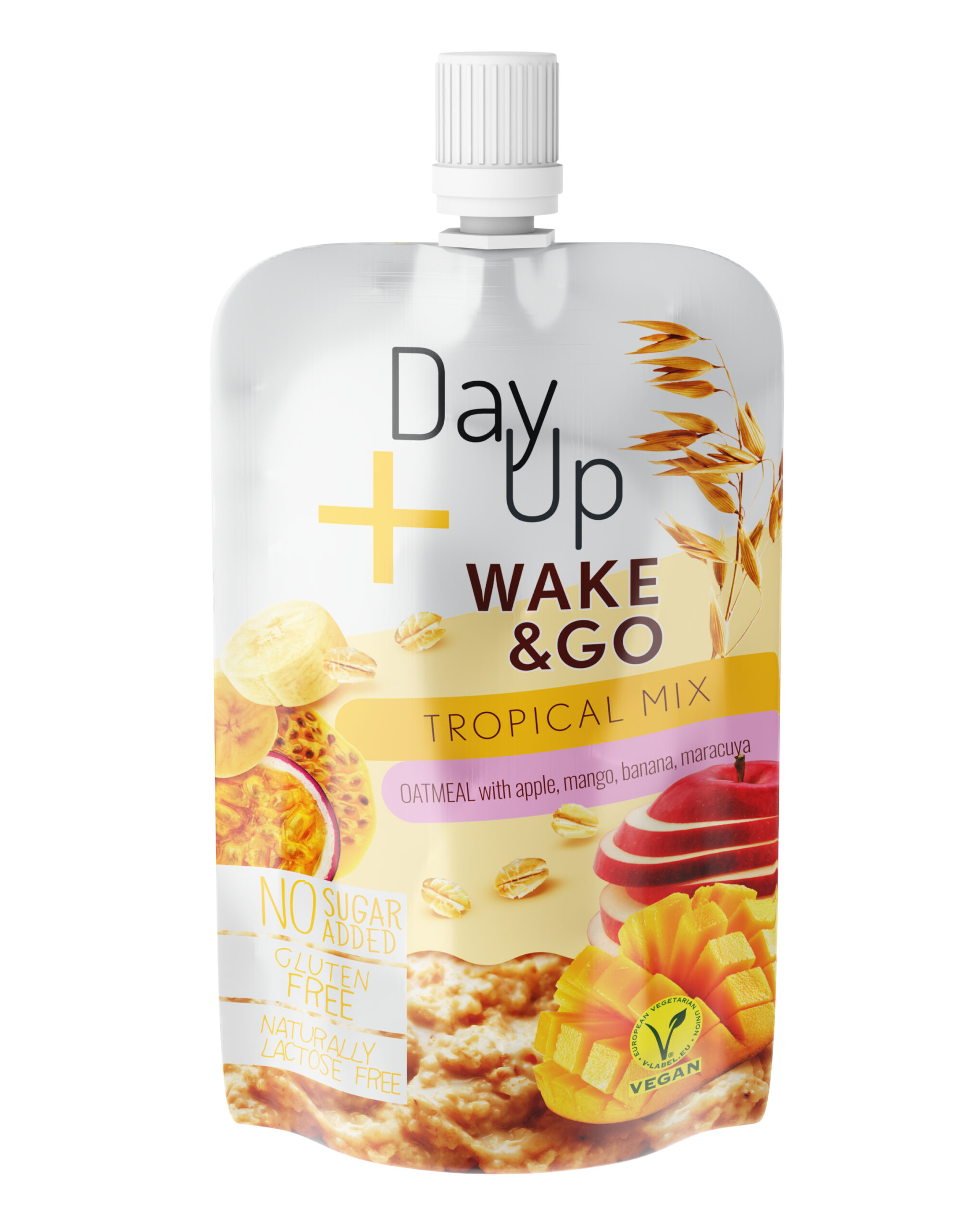 DayUp WAKE&GO TROPICAL MIX Ingredients: apple puree 33,9 %, concentrated mango puree 25 %, water, banana puree 9 %, gluten-free oat extract 8 %, gluten-free oat flakes 5 %, passionfruit puree 3 %, lemon concentrate.